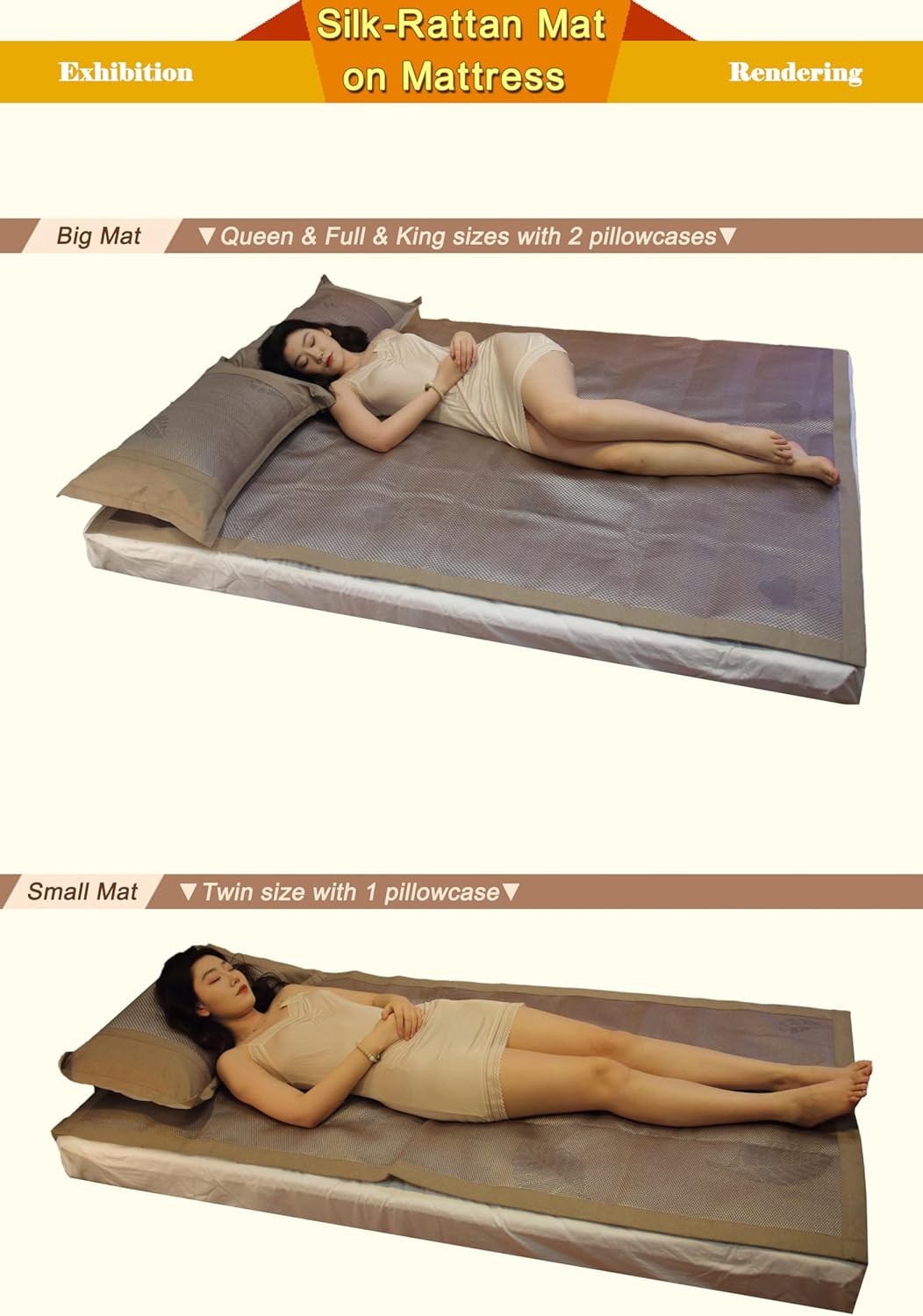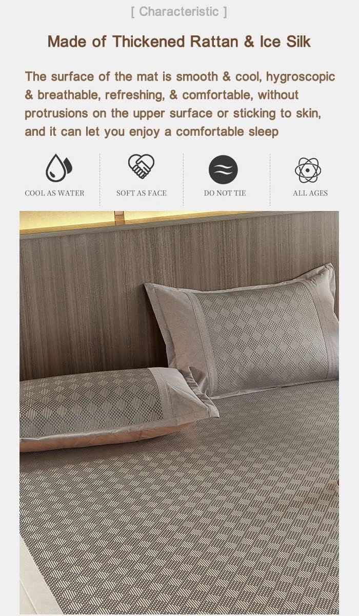 This is famous cooling bedding mat made of ice silk and rattan. It has very smooth and cool surface and it is very comfortable for summer and also under hot weather in spring and fall. The surface of the mat is hygroscopic & breathable and refreshing, & comfortable, without protrusions on the upper surface or sticking to skin, and it can let you enjoy a comfortable sleep. It's suitable for both simmons and hard surface.